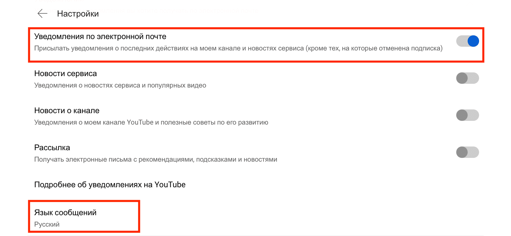 Язык самих роликов от этого не зависит. Уведомления от Ютуба по умолчанию приходят на том же языке, который установлен, как основной. Но если вы хотите это изменить, в настройках вашего аккаунта выберите «уведомления», а в самом низу нажмите «уведомления по электронной почте». Там же в разделе «язык» можете выбрать нужный.